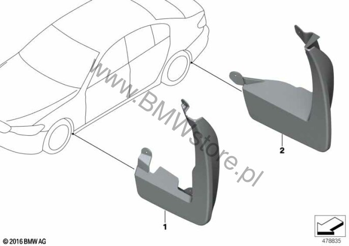 | 02 | Pakiet areodynamiczny M (0715) = NIE M Pakiet sportowy (0337) = NIE Pakiet aerodynam. M BMW Performance (0ZZ8) = NIE Wersja krajowa Chiny (08AA) = NIE Fartuchy p/błotne tylne 82 16 2 413 633 | G30 | 1 |