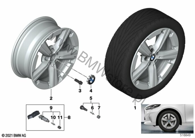 BMW obr.st.l. Star Spoke 875 (01LS) = TAK Opony zimowe zamiast letnich z fabryki (0931) = TAK Osłona piasty z niebieskim pierścieniem 36 13 6 852 052 |