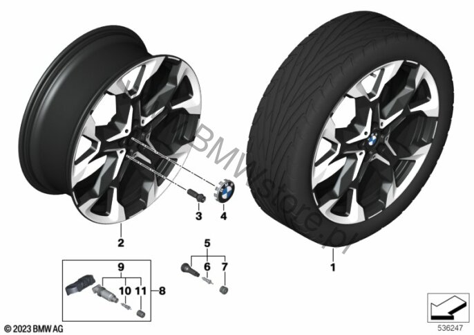Wskaźn. ciśnienia pow. w oponach (02VB) = NIE BMW obr.st.l.szprycha Y 874I STD SO BIC (01GP) = TAK Zawór gumowy 36 12 1 116 326 |