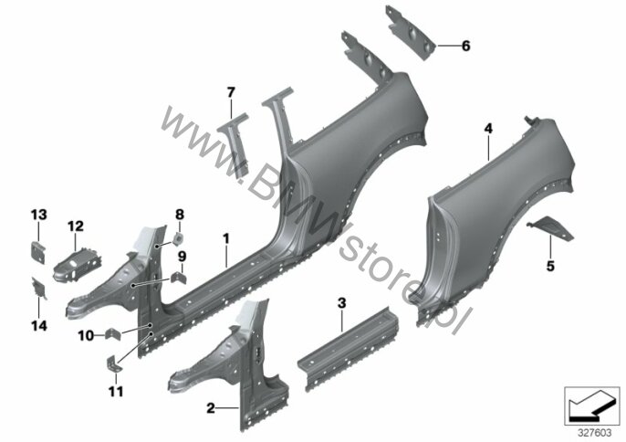 Przeprowadzane za pomocą techniki naprawczej klejenia/nitowania. ***** Panel boczny, tylny, prawy 41 00 7 387 970 Konieczne do naprawy |