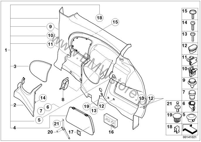 Dla samochodów z System HiFi Harman Kardon (S674A) = TAK i cordoba-beige (CB) = TAK Tapicerka boczna tylna prawa 51 43 7 070 346 |