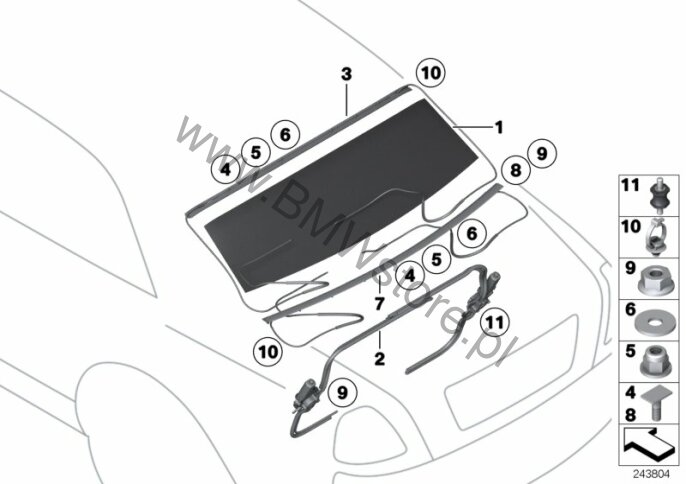 Dla samochodów z Osłona przeciwsł. tylnej szyby czarna (SREGA) = TAK lub Osłona przeciwsł. tyln. cz. poj. czarna (SREKA) = TAK Dolna szyna prowadnicza zasłonki 51 31 7 218 483 tylko w połączeniu z |