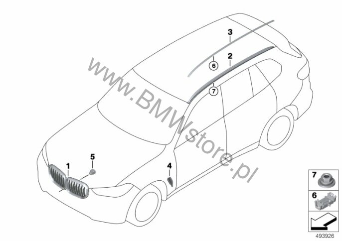 Dla samochodów z Reling dachowy, aluminium satynowane (S3ATA) = NIE i Ind. relingi dach. wys. poł. Shadow Line (S3MCA) = NIE Zaczep listwy ozdobnej dachu 51 13 7 469 803 |