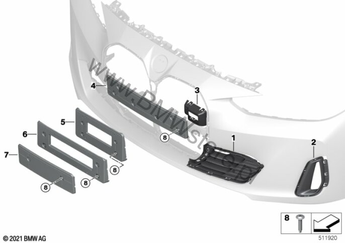 Sterowanie mocowania tabl. rej. (0992) = TAK Pakiet areodynamiczny M (0715) = NIE Podstawa tablicy rejestracyjnej z przodu 51 13 8 738 600 |