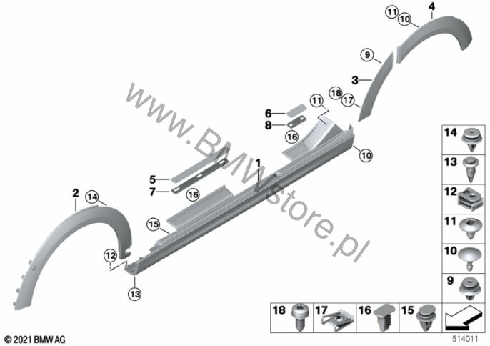 Asystent parkowania (05DP) = TAK Zestaw aerodynam. JCW (03A1) = NIE Osłona nadkola przednia prawa 51 11 5 A3C 7F2 |