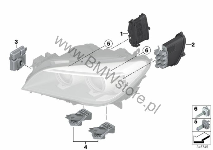 Dla samochodów z Adaptacyjne doświetlanie zakrętów (S524A) = TAK Moduł sterowników reflektorów 63 11 7 408 425 |